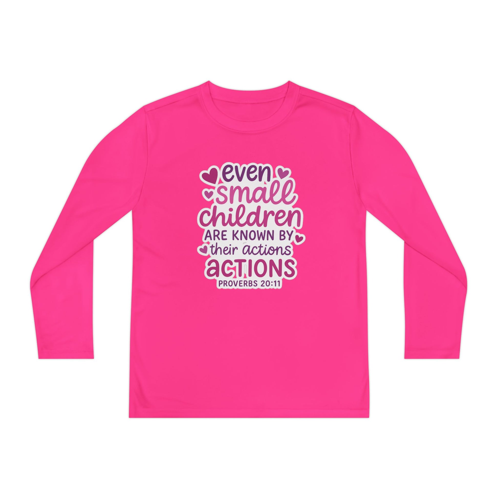 "Even Small Children" Proverbs 20:11 Girl's Bible Verse Long Sleeve Tshirt (Pink Logo)