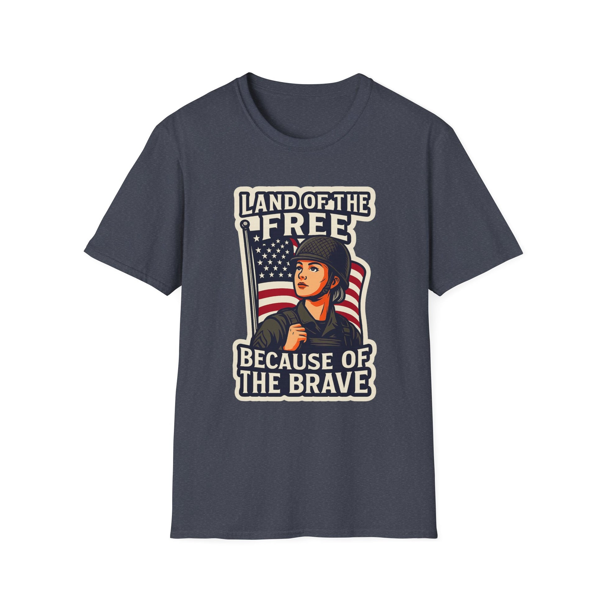 "Land of the Free because of the Brave" Patriotic Softstyle T-Shirt (Female Soldier)